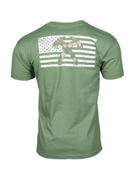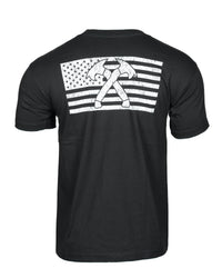 These Jack Carr signature bone frog tees are 100% made in the USA. These tees feature a small bone frog on the left chest and an American flag on the back with the crossed hawks.